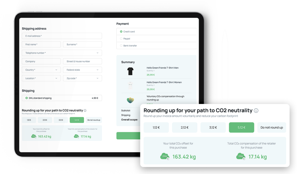 The plugin offers two main functions. First, a program for store operators where a certain percentage of the purchase price is used for carbon credits. This percentage is included in the purchase price and half is credited to the customer’s account and half to the store owner’s carbon account. Secondly, customers have the option to round up their invoice amount at checkout to offset their carbon footprint. The rounded up amount is used to purchase carbon credits, 100% of which are credited to the customer’s account.